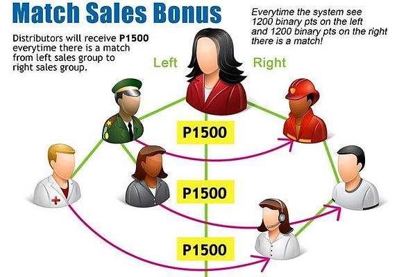 -MATCH SALES BONUS OR BINARY INCOME- EARNED P1,500.00 EVERY MATCH OF YOUR LEFT AND RIGHT FORCE POINTS (PRODUCT TO PERSON BINARY POINTS OR PRODUCT TO PRODUCT BINARY POINTS)